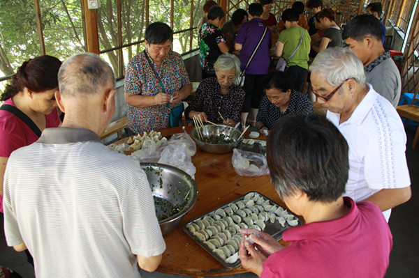 此次活動共有120多名體協會員參加,大家都想借此機會和大自然來個親密接觸,體協委員利用休息時間為大家采購了豐富美味的食物。利用新世紀綠草地依山伴水的地理資源優勢,在秋日和煦的陽光下,在風景秀麗的南明湖邊,我們老年人在綠草地上展現了 “年輕人”舞步,跳著佳木斯健身操動作,擺動雙臂,邁開雙腳,走出健康,走出幸福。當走進餐廳看見桌子上擺好的餃子皮和餃子餡,老同志們便紛紛摩拳擦掌,躍躍欲試。他們各自分工后便熱火朝天的忙起來,現場笑聲不斷。