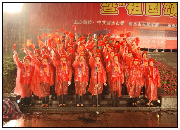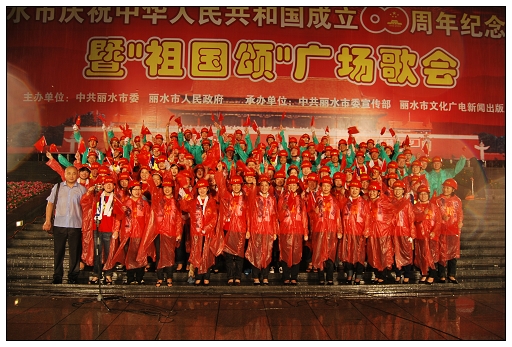 麗水市慶祝新中國成立60周年紀(jì)念活動(dòng)暨“祖國頌”廣場(chǎng)歌會(huì)隆重舉行。歌會(huì)分革命英雄贊、建設(shè)新中國、走進(jìn)新時(shí)代三個(gè)篇章進(jìn)行。15個(gè)方陣依次進(jìn)行大合唱,每個(gè)方陣各唱一首歌。