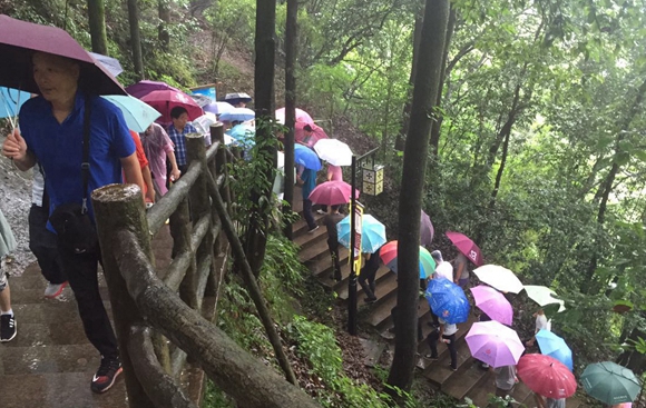 南明山的山道上,大家穿著雨衣、撐上雨傘、并肩前行,成了一道最美的風景!