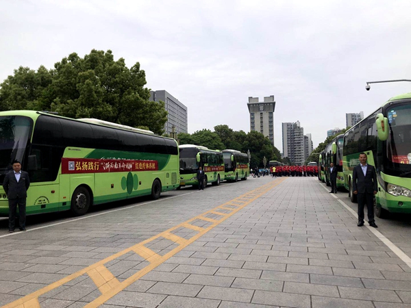 4月19日早上,在市政府南門廣場,麗汽集團旅游汽車分公司16輛綠色豪華大巴齊刷刷地排列著,16位駕駛員統一著裝,整齊劃一地站在車門迎候游客。這是2019年麗水市弘揚踐行“浙西南革命精神”系列活動啟動儀式暨勞模、一線(優秀)職工紅色療休養活動發團儀式的現場。綠色大巴與著紅色服裝的先進相互映襯,形成了“紅+綠”融合發展的場景,和諧的畫面吸引了在場人員的關注,紛紛拿出手機拍場景,曬朋友圈。